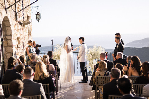 At 5:45pm, 34 guests gathered on the terrace at Château Eza. And let's just take a moment to talk about that terrace — because when your ceremony backdrop is the entire Mediterranean coastline stretching out hundreds of metres below you, bathed in the warm light of an October evening on the Côte d'Azur... you don't need much else.