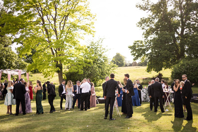 After the ceremony, guests spilled out onto the lawns for cocktails and canapés — Spin & Shake behind the bar mixing drinks while Georgie Rose carried on singing for another hour and a half. The summer sun was doing its thing, the Suffolk parkland looking absolutely stunning, and there was that gorgeous buzz of a post-ceremony celebration where everyone's just happy and buzzing and slightly teary.